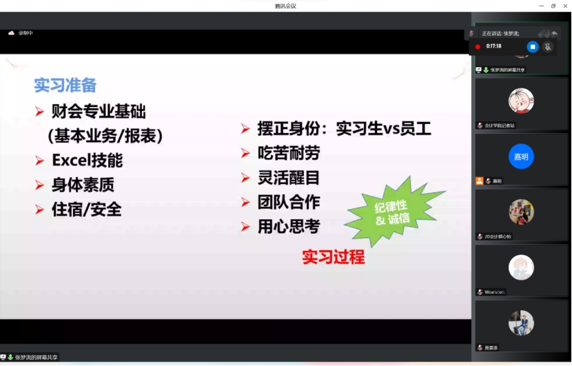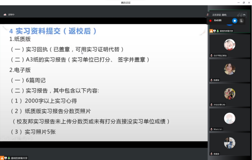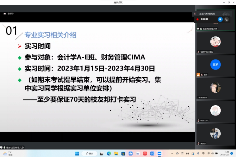 12月7日,太阳成集团tyc33455会计学院(以下简称“我院“)依据我校《实习教学大纲》要求,在腾讯会议举行了2020级会计学实习动员会。我院会计学专业副主任张梦洮老师、辅导员付迪老师、李香香老师、教学秘书田嘉明老师出席了本次会议,2020级会计学A-E班、财务管理CIMA班的学生参与了此次动员会。