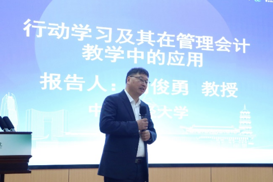 中央财经大学刘俊勇教授分享的主题是《行动学习及其在管理会计教学中的应用》。首先,刘俊勇教授向我们介绍了行动学习的六个基本要素并指出了目前行动学习在全国高校和企业单位的推进情况。他以中央财经大学MPAcc入学的第一课为例,为我们讲解奥云教学法是如何将行动学习和云班课有机结合起来。他着重指出云班课可以通过提问、小组研讨及课堂展示、团队共创、总结反思等环节来展开。其中团队共创是非常有必要创建小组群,然后分组讲解了管理会计模型图。刘俊勇教授认为这种方法不仅可以培养学生的团队意识,也可以实现课堂以学生交流为中心的当代教育目标,从而激发众多学生的散发性思维,挖掘学生身上更多未知的潜能。