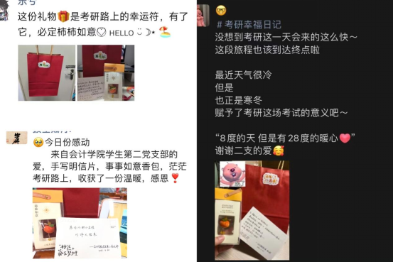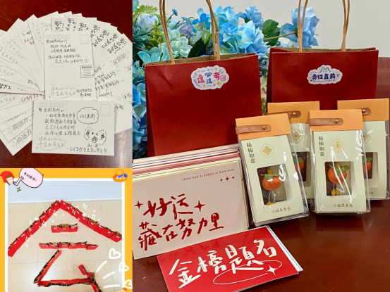 活动前夕,会计学院学生第二党支部的同志们认真筹划,准备了明信片、“柿柿如意”香包等小礼物,并亲手写下祝福语,祝愿考研学子旗开得胜,一“研”为定。