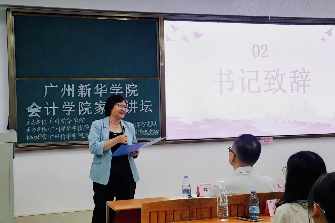 会计学院党总支坚持以习近平新时代中国特色社会主义思想为指导,全面贯彻党的二十大和二十届三中全会精神,落实立德树人根本任务,立足于会计学院“国家一流本科专业”建设,以“六位一体”构建“高质量党建+”品牌建设,高效推动党建与业务有机融合,进一步促进学院财会审人才培养的深度融合,实现学院各项事业高质量发展。为助力财会专业学生明晰职业发展方向,应对行业变革挑战,会计学院党总支于2025年5月7日成功举办“浅谈财会专业大学生的逆袭之路”家长讲坛,助力学生将专业知识与行业前沿动态有效衔接,提升职业竞争力。本次活动特别邀请到学生家长戴小娟老师作为主讲嘉宾。会计学院党总支书记李安兰老师、会计学院党总支副书记邓楚云老师和会计学院师生出席本次家长讲坛。