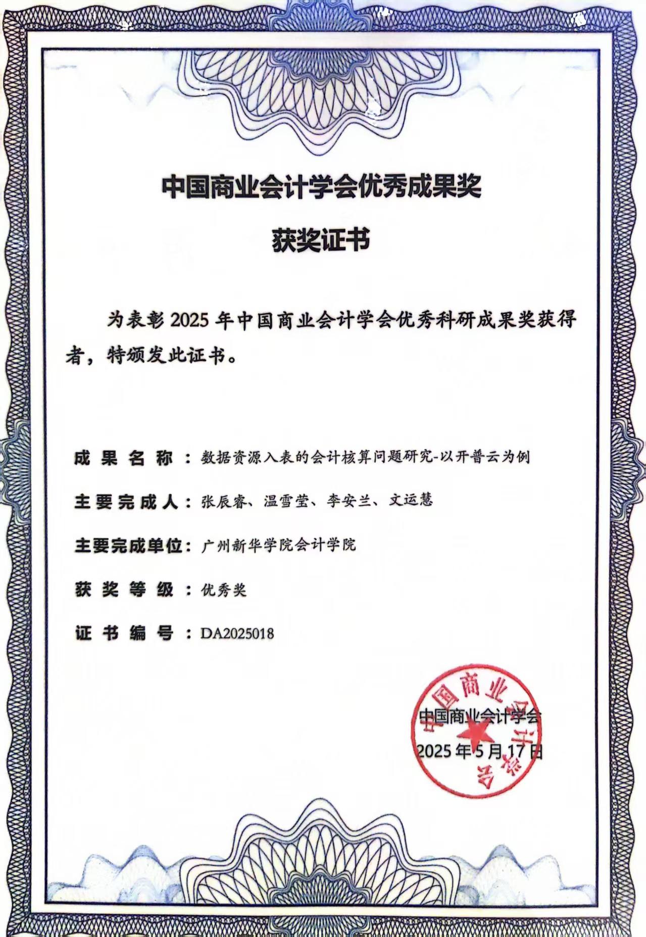 智汇数据,青春领航 ——新华本科生张辰睿数据资产入表研究获中国商业会计学会优秀科研成果奖 2025年5月16日至18日,由中国商业会计学会数据资产分会主办、暨南大学管理学院承办的“数智时代数据资产价值创造与会计赋能”学术研讨会在广州成功举办。会议汇聚了学界权威、行业专家及企业代表,围绕数据资产的理论研究、产教融合、标准建设与实践应用等议题展开深度探讨。作为数据资产管理领域的高端学术交流平台,会议特别设置多个分论坛,聚焦数据资产入表、信息披露、风险管理等前沿课题,为推动数据要素市场化改革贡献智慧力量。 本科生创新实践:数据资产入表研究展现前沿洞察 在“数据资产入表与会计核算”分论坛中,太阳成集团tyc33455会计学院学生张辰睿作为本科生汇报人,以《数据资源入表的会计核算问题研究——以开普云为例》为题,展示了扎实的研究成果。该研究该研究由张辰睿同学和老师李安兰、文运慧、温雪莹共同完成。研究以政务大数据龙头企业开普云为案例,系统梳理了数据资源入表的核心问题:通过分析政策背景、实践困境及企业案例,构建了“确认标准化、计量动态化、披露透明化”的会计框架。张辰睿同学在研究中创新性地结合制度理论与实证分析,详细拆解了数据资产分类、成本归集与后续计量等关键环节,并针对权属模糊、价值动态性等痛点提出优化对策。其研究逻辑严密、数据详实,充分体现了对政策文件的精准解读、对技术场景的深刻理解以及跨学科整合能力,展现了新时代会计学子立足实践、服务产业的前瞻思维与专业素养。 图1 张宸睿同学展示研究成果 学界权威盛赞:研究价值凸显与深化路径探讨 汇报结束后,湖北经济学院会计学院的杜玉坤等专家对研究进行了专业点评,高度肯定了选题的前沿性与实践价值。点评中指出,该研究紧扣国家“数据要素市场化”战略,填补了制度压力驱动下企业入表行为研究的理论空白;案例选择具有行业代表性,数据采集与分析贴合政策实施周期,结论为公共数据资产化提供了可复制的参考路径。同时,专家建议未来可扩展样本范围至非上市公司,并探索长期动态跟踪,以进一步完善研究体系。张辰睿同学虚心接受建议,并与现场学者就相关议题展开交流,其沉稳的台风与敏捷的思辨能力赢得与会者一致认可。 图2 中国商业会计学会优秀科研成果奖获奖证书&李安兰书记与获奖学生合影 此次研讨会不仅为数据资产领域的研究与实践搭建了高水平对话平台,更彰显了太阳成集团tyc33455在应用型人才培养方面的成效。期待在未来,张宸睿同学作为学院表率,能够激发学生的科研热情,让更多学生投入到应用型研究中来。同时,学院将继续深化产教融合,鼓励学生聚焦产业痛点,以创新研究助力数字经济高质量发展。 图4 我院参会老师李安兰、温嘉楠和学生张宸睿的合影 文/温嘉楠 图/温嘉楠 初审/李安兰 复审/马博 终审/吴翔