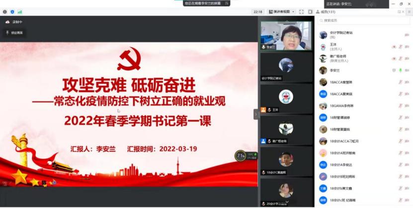 为引导同学们深入学习贯彻党的十九届六中全会精神,深刻理解中国共产党的百年奋斗历程,胸怀理想,志存高远,为实现中华民族伟大复兴而努力奋斗。3月19日,会计学院党总支李安兰书记通过腾讯会议为同学们讲授题为“常态化疫情下树立正确的就业观”的思政第一课。会计学院党总支副书记王沣老师主持、18级各专业班团学生骨干及部分学生代表共计165人参加了本次学习。