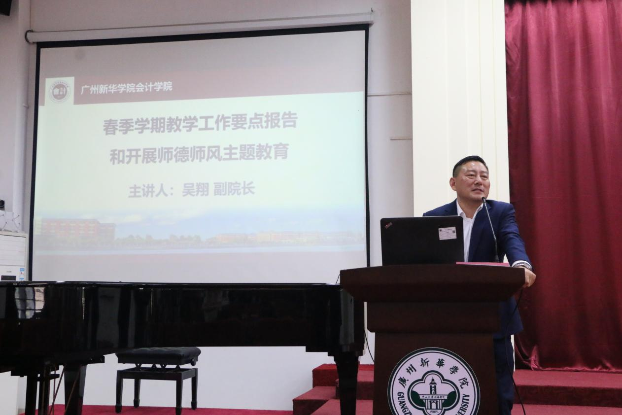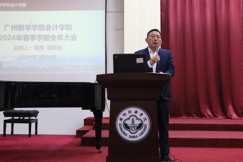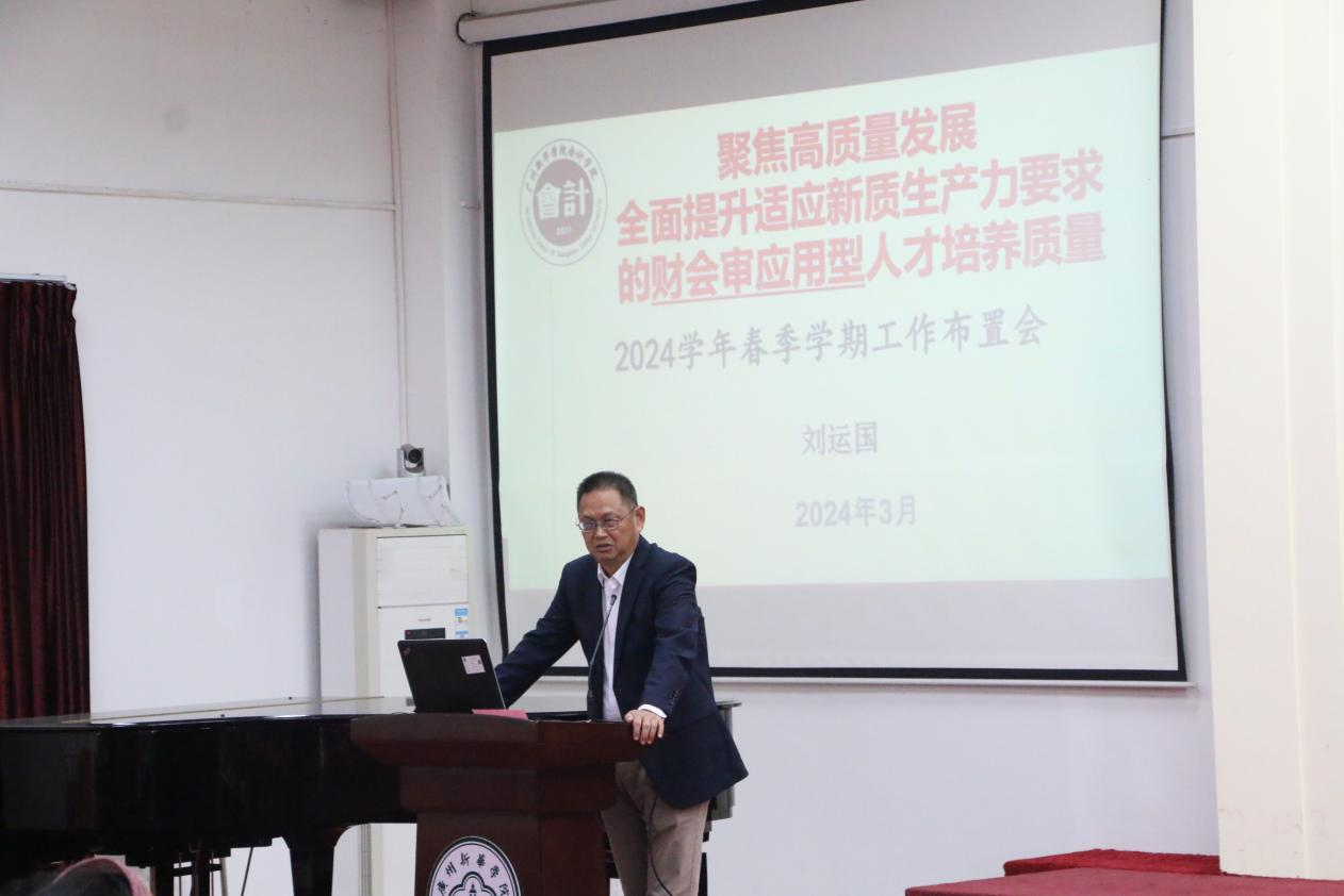 接下来,刘运国院长就春季学期工作部署发表了主题讲话。他强调新华学院作为一所应用型高校,应致力于提升“财会审”应用型人才的高质量培养,紧密贴合新质生产力的需求。刘院长同时传达了全国教育工作“七项重点任务”和广东省教育厅提出的“八大工程精神”,详细阐述了我院新学期的工作思路与要点。他表示,我们要紧跟国家政策导向,深入践行党的二十大精神,坚持“立德树人、三全育人、五育并举”理念,紧扣“学术强校、质量立校、特色兴校、开放办校”的发展战略。针对工作要点,刘院长明确指出,新学期要紧密围绕“合格评估、一流专业建设、硕士点建设”三大核心任务进行攻坚,坚守本科教育高质量的生命线,持续推进教育教学综合改革。此外,他还对师资队伍建设、日常教学管理、科研教研、社会服务及学院文化建设等工作提出一系列举措和要求,力求会计学院在新一年里各方面工作再上一个新台阶。