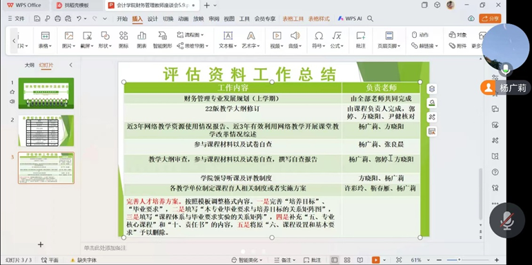 会议的第二个环节是有关财务管理课程评估工作总结以及未来的计划部署,杨广莉主任首先对评估资料工作的已有成果和进展进行分享,全体教师齐心协力,团体协作,教学评估工作如期顺利进行。但是目前仍然存在分工不合理,集体备课较少等问题,因此为了进一步推动教学评估工作的顺利进行,杨主任提出以下提议:1、构建教学评估工作内容的合理分工和轮换制。2、财务管理和财政学进行集体备课,对期末考试出题方式和平时成绩构成进行积极交流和经验共享,丰富完善基层教学活动组织材料。3.在下一轮人才培养方案重新修订时对课程设置进行调整和完善。