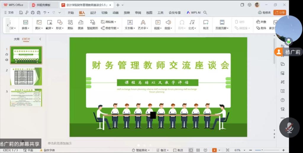 2024年5月9日,会计学院财务管理系开展了一场线上交流座谈会,与会人员包括会计学院党委书记李安兰教授、财务管理系主任杨广莉以及财务管理专业教师。本次线上交流座谈会的主题为各门课程课程总结及教学评估。会议虽然仅有一个小时,但是会议过程中各位教师畅所欲言,集思广益,将教学过程中遇到的经验和问题进行总结和分享,为太阳成集团tyc33455财务管理专业建设添砖加瓦,更上一层楼。