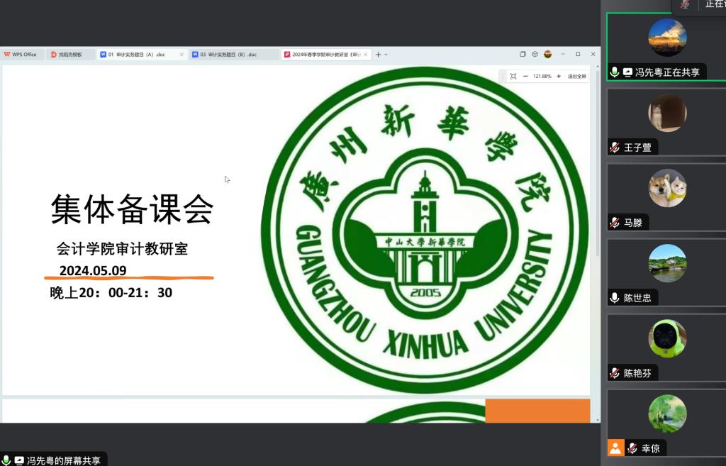 2024年5月9日,会计学院审计教研室开展实务课集体备课活动。审计实务是我校2024年校一流本科课程,此次的集体备课由课程负责人陈世忠副教授主持,教研室主任幸倞副教授及刘健、陈艳芬、马滕、冯先粤、王子萱等老师共同参与。