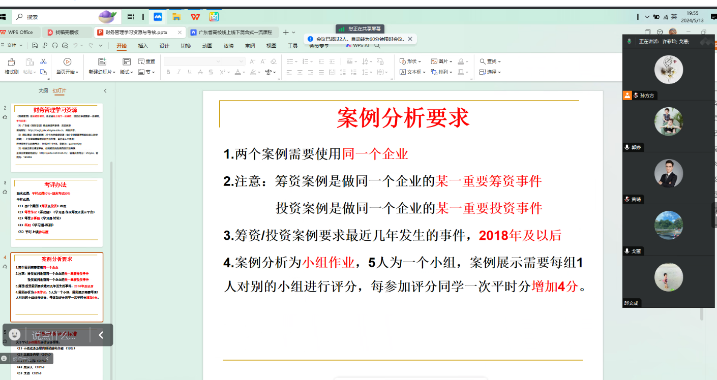 2024年5月13日,财务管理课程组进行集体备课,财务管理是我校省一流线上线下混合式本科课程,此次的集体备课由课程负责人许彩玲老师主持,黄靖、孙方方、郭婷、邱文成、戈蕙等老师共同参与。