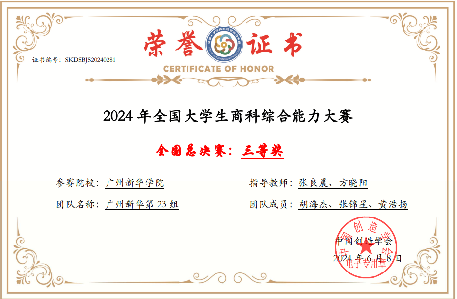 在刚刚落幕的中国创造学会举办的2024年全国大学生商科综合能力大赛中,来自全国各地的大学生团队经过激烈角逐,展现了他们卓越的商业洞察力和创新能力。我校会计学院组成的多支代表队在此次竞赛中荣获三等奖,这是对他们辛勤努力和卓越才能的肯定。