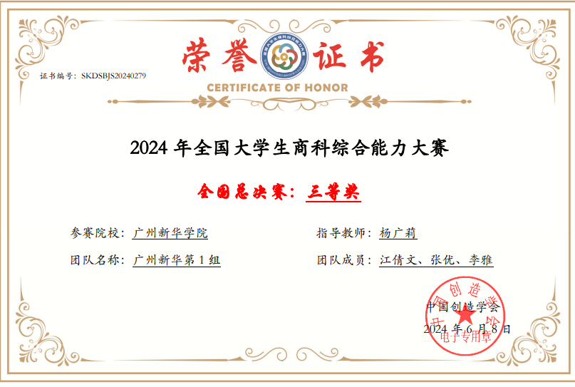 会计学院精英团队荣获商科综合能力大赛国赛三等奖荣誉证书