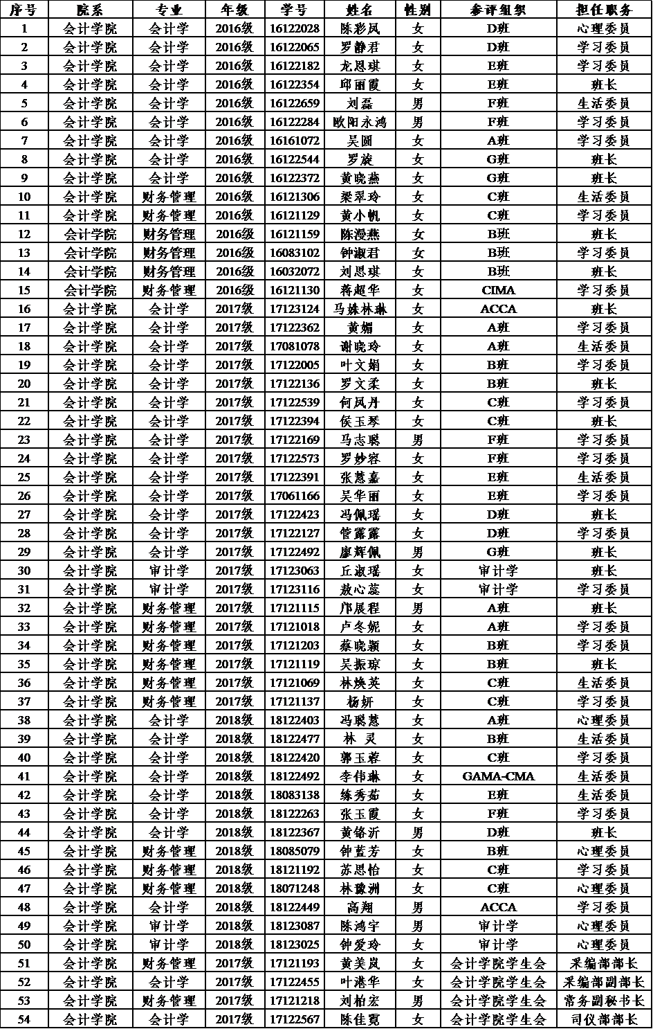 根据我校《关于评选2018学年中山大学新华学院优秀学生干部的通知》、《中山大学新华学院优秀学生干部评选办法》的精神要求,本着公开、公平、公正的评选原则,经个人申请、各班级初评、学院初审,决定拟推荐陈彩凤等54名学生为2018学年优秀学生干部。现予以公示。