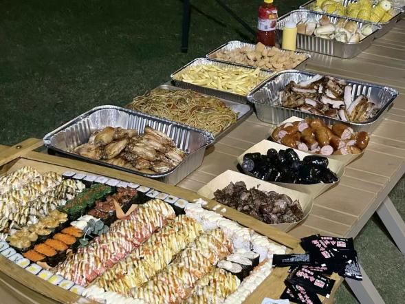 随着夕阳渐渐西沉,帐篷里大家围坐在一起,分享着美味的食物。香甜的蛋糕、可口的水果、酥脆的零食,诱人的炸鸡炒面,每一口都充满了幸福的味道,在夕阳的余晖中,这些食物看起来更加诱人。同学们一边品尝着美食,一边聊天说笑,分享着开学以来的趣事和心得。这种温馨的氛围让大家感受到了班级的温暖和团结。